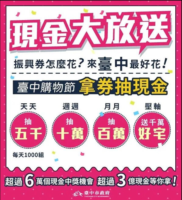 此外,購物節期間消費滿500元即送一張抽獎券,即可參加日日抽、週週抽、月月抽以及壓軸抽千萬好宅等好康活動,詳情可上台中市經濟發展局臉書( https://reurl.cc/Xlj17j )或台中購物節官網( https://reurl.cc/bnl4L6 )查詢。